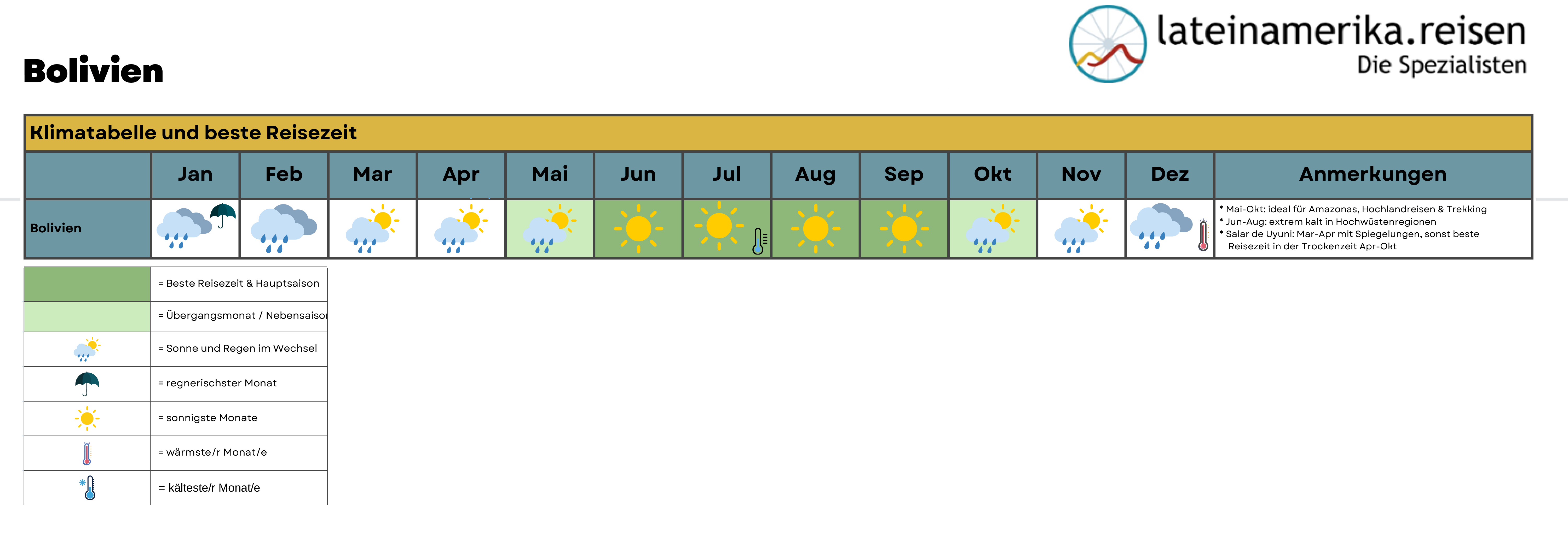 Bolivien ist das ganze Jahr über zu bereisen. Allerdings sind während der Regenzeit von Dezember bis März Wanderungen und Bergtouren nicht zu empfehlen.