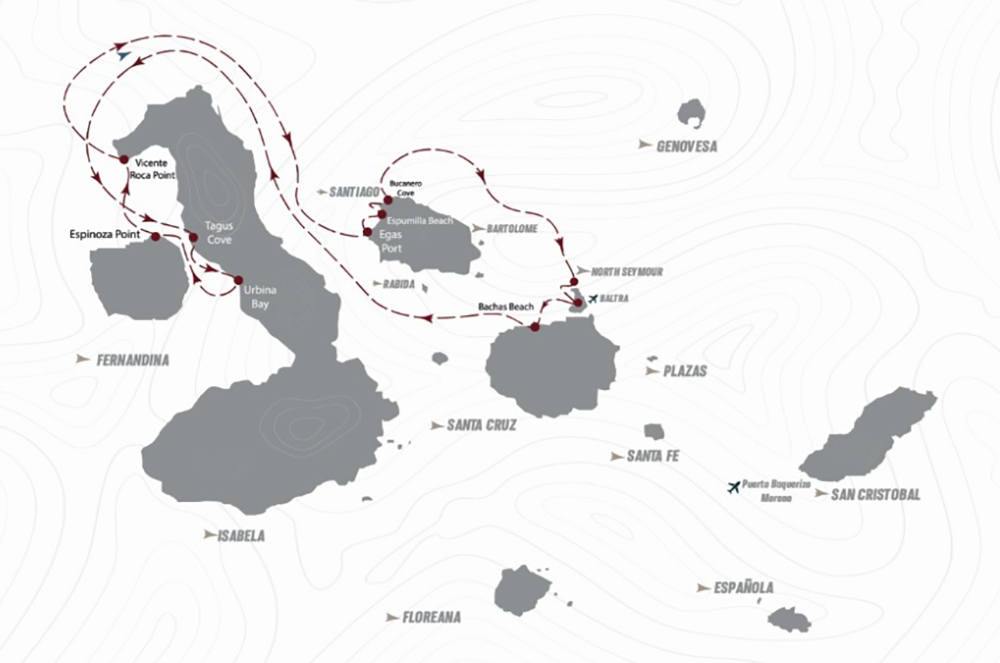 Die Bucht befindet sich an der Nordwestküste von Isabela. Es ist ein historischer Ort, der 1835 von Charles Darwin besucht wurde und an dem Besucher in den vergangenen Jahrhunderten Graffiti in die Felswände geritzt haben. Seit den 1800er Jahren wurde dieser Ort von Walfängern und Piraten aufgesucht, die die Gegend als Ankerplatz nutzten. Der Name des Ortes geht auf das Jahr 1814 zurück, als ein britisches Schiff, die The Tagus, hier ankerte, um Riesenschildkröten zu suchen, die als Nahrungsquelle für das Schiff dienen sollten. Bewundern Sie eine Vielzahl von Seevögeln, darunter Blaufußtölpel, Noddys, Seeschwalben, flugunfähige Kormorane und - je nach Jahreszeit - Galapagos-Pinguine. Gelegentlich sieht man auch Spechtfinken, den Galapagosfalken, die Gelbspötter oder den Großschnabelschnäpper. Nach einer trockenen Landung steigen wir den Pfad hinauf, um den Darwin-See zu besuchen. Der See befindet sich an den Hängen des Vulkans Darwin und ist überraschenderweise ein Salzwassersee, der über dem Meeresspiegel liegt. Unser naturkundlicher Führer wird Ihnen die verschiedenen wissenschaftlichen Theorien für dieses Vorkommen erläutern. Die Tagus Cove lädt auch zum Schnorcheln ein, um Haie, Meeresschildkröten, Seesterne und tropische Fische zu beobachten.