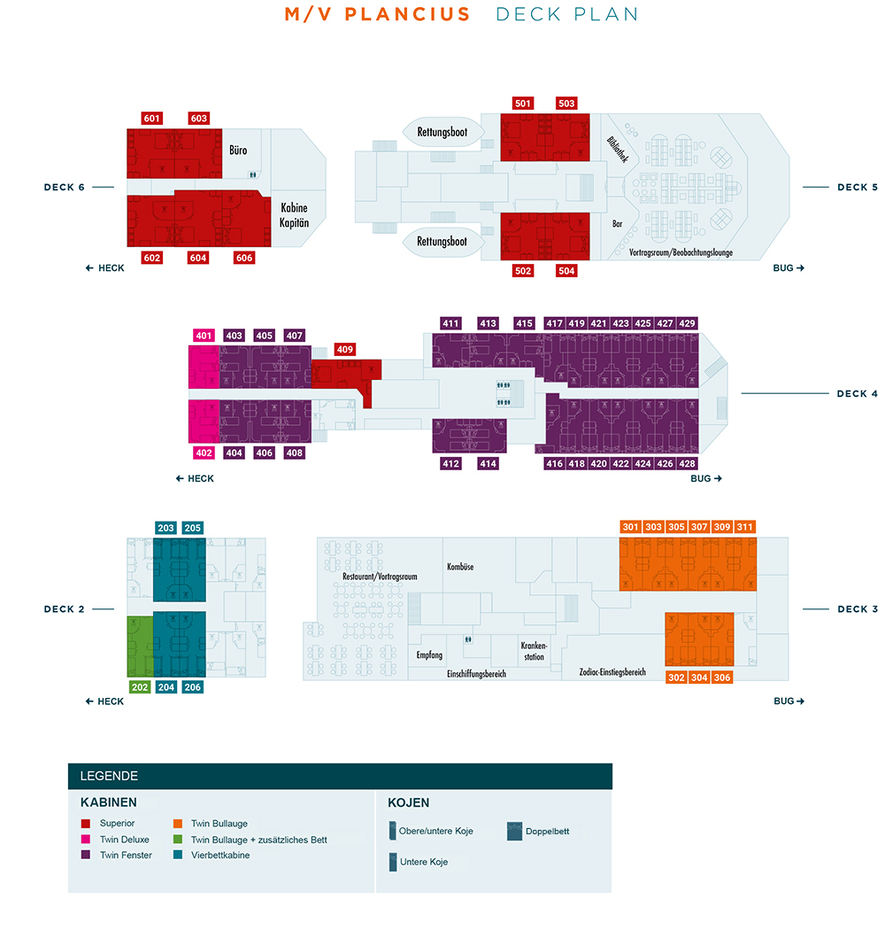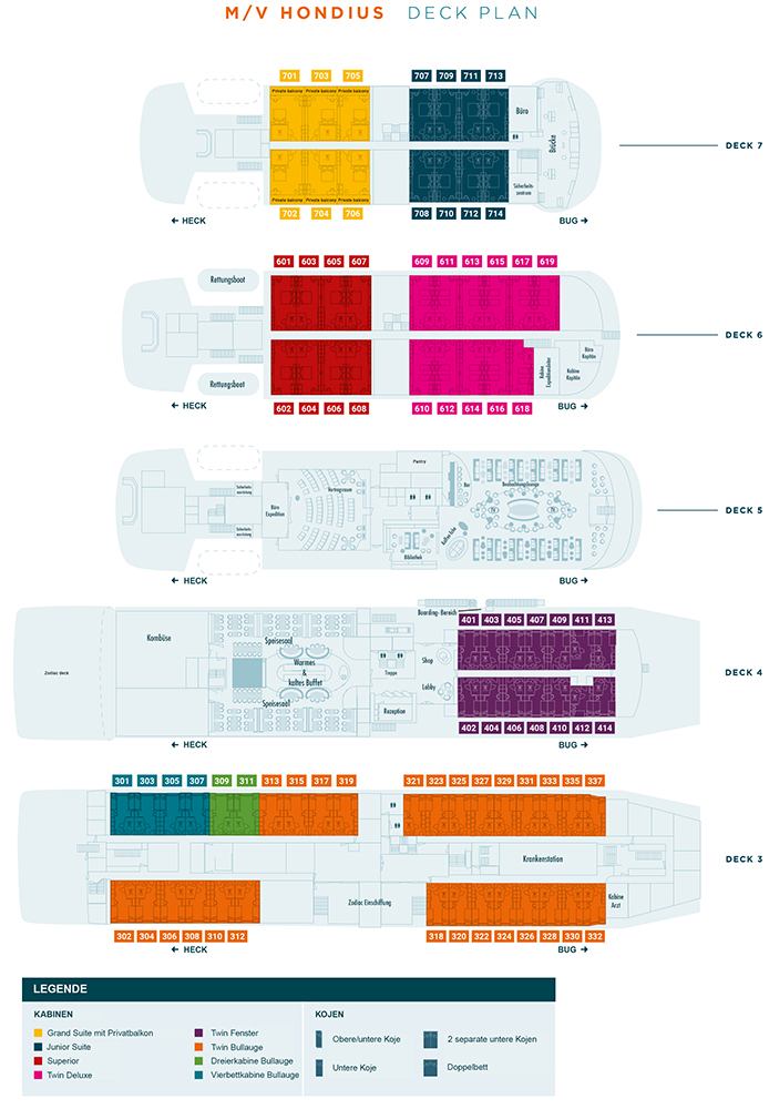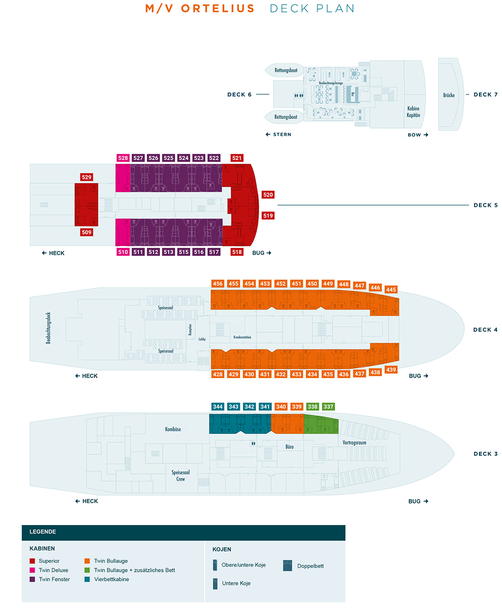 Preise für weitere Zimmerkategorien, Details zur Ausstattung der Kabinen und sonstige Informationen auf Anfrage.