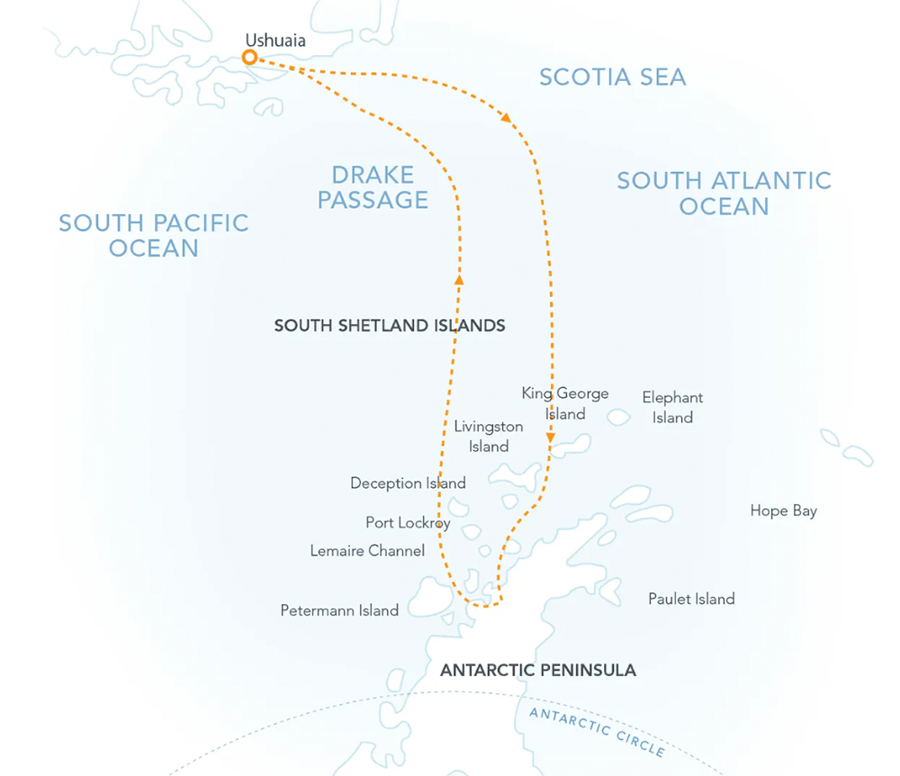 Die Antarktis - Das Land der Superlative! Der Expeditionsleiter und der Kapitän erstellen eine flexible Reiseroute, basierend auf den aktuellen Wetter- und Eisverhältnissen. Sie führt durch die schönsten erreichbaren Buchten und Kanäle, wo wir Pinguin- und Vogelkolonien besuchen und Wale bei der Futtersuche beobachten. Vielleicht ergibt sich auch die Möglichkeit, eine aktive Forschungsstationen oder historische Basisstation zu besuchen.