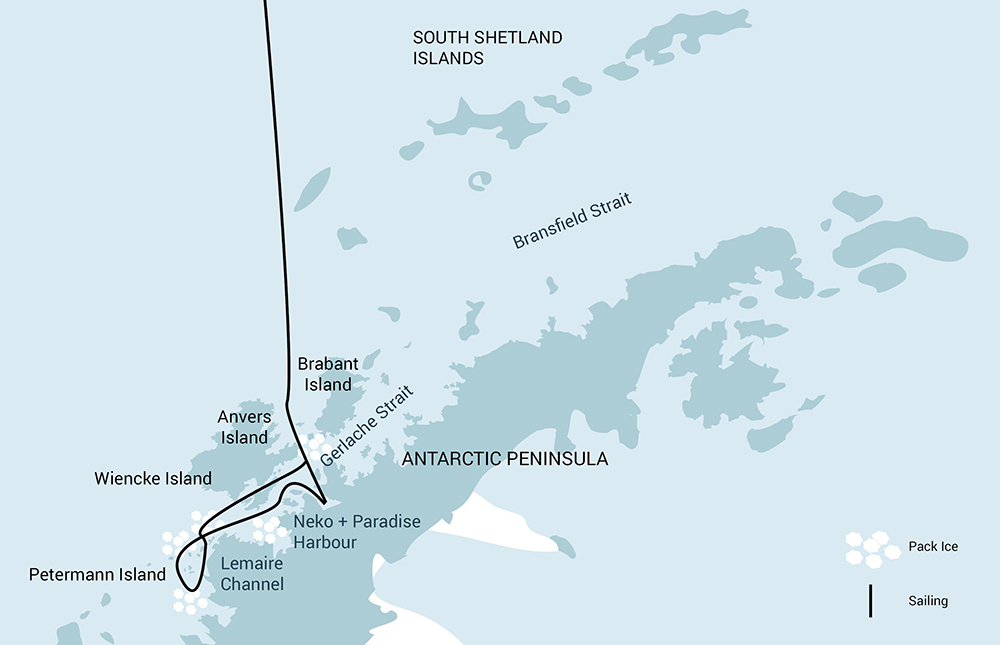 Graue, schneebedeckte Steinspitzen, Türme aus gebrochenem, blau-weißem Eis und eine dramatische Tierwelt erwarten Sie. Zunächst passieren Sie die schneebedeckten Melchior-Inseln und den Schollaert-Kanal und fahren dann zwischen den Brabant- und Anvers Inseln.